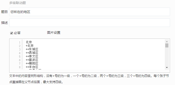 多级联动题的编辑也与联动题的树形结构一样,用+代替所属的级次。